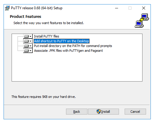 Quindi, il programma di installazione chiede di selezionare le funzionalità del prodotto da installare. Probabilmente si desidera aggiungere un collegamento sul desktop se si prevede di utilizzare frequentemente il software. Tutte le altre opzioni in genere dovrebbero essere abilitate. Quando sei pronto, fai clic su “Install”.