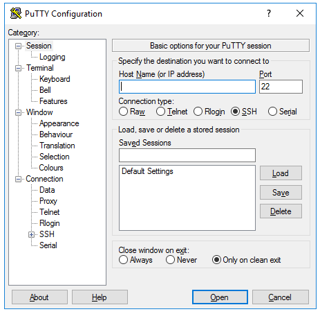 Una volta completata correttamente l’installazione, basta avviare il software e dovresti visualizzare una finestra con il titolo “Configurazione PuTTY” con un campo “Nome host” nella parte centrale superiore come mostrato in figura